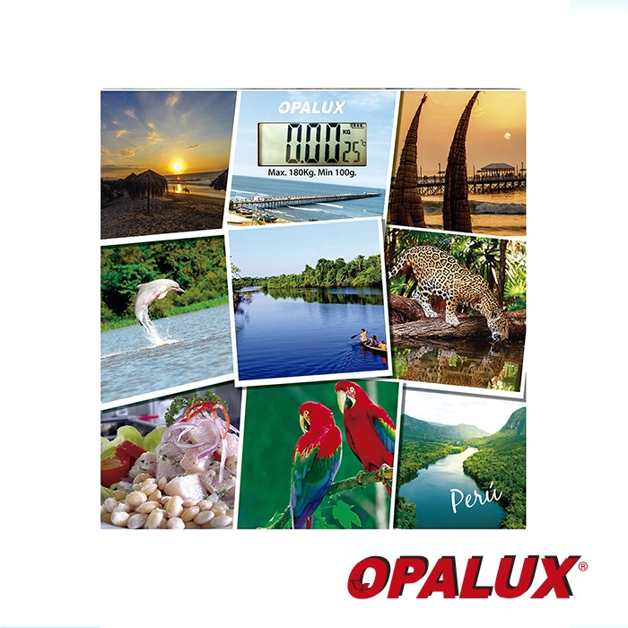 BALANZA ELECT.”OPALUX” 180 KILOS ULTRA SLIM, CUADRADA, COSTA, SIERRA, SELVA PANTALLA LCD (10XCJ) INDICADOR DE TEMPERATURA