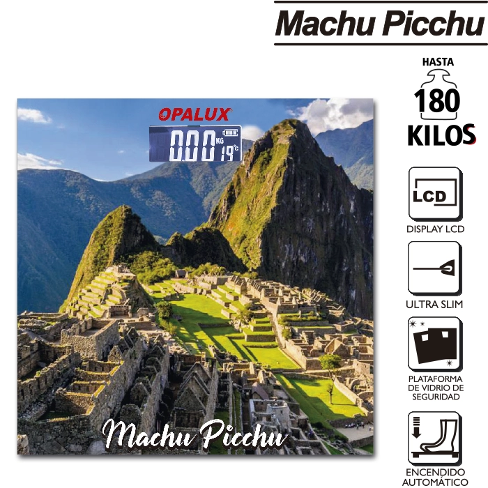 BALANZA ELECT.”OPALUX” 180 KILOS ULTRA SLIM, CUADRADA, MACCHU PICCHU PANTALLA LCD (10XCJ) INDICADOR DE TEMPERATURA