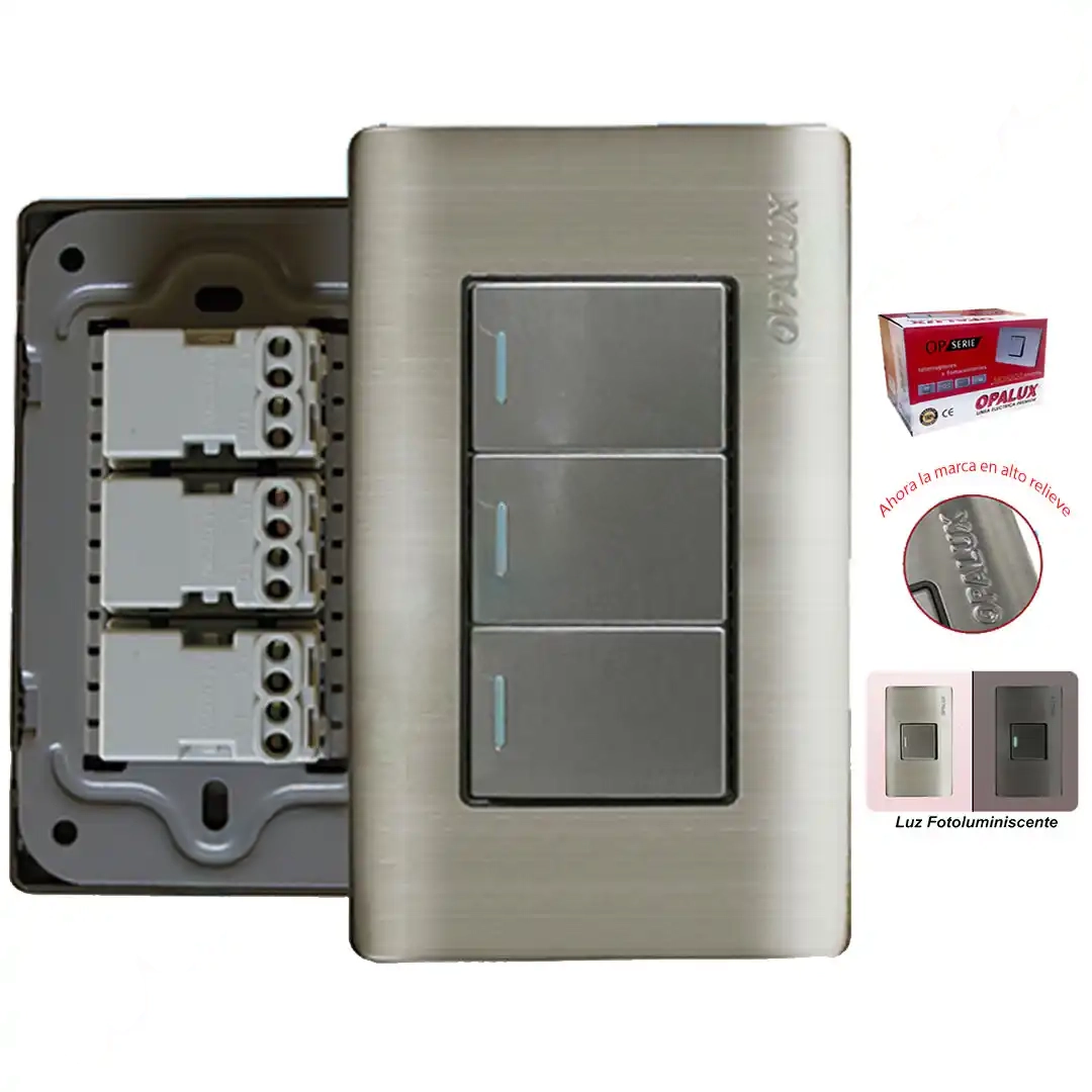Interruptor triple dado mediano línea “EJECUTIVA” color metálico satinado diseño Italiano con indicador visual nocturno fotoluminicente marca “Opalux”