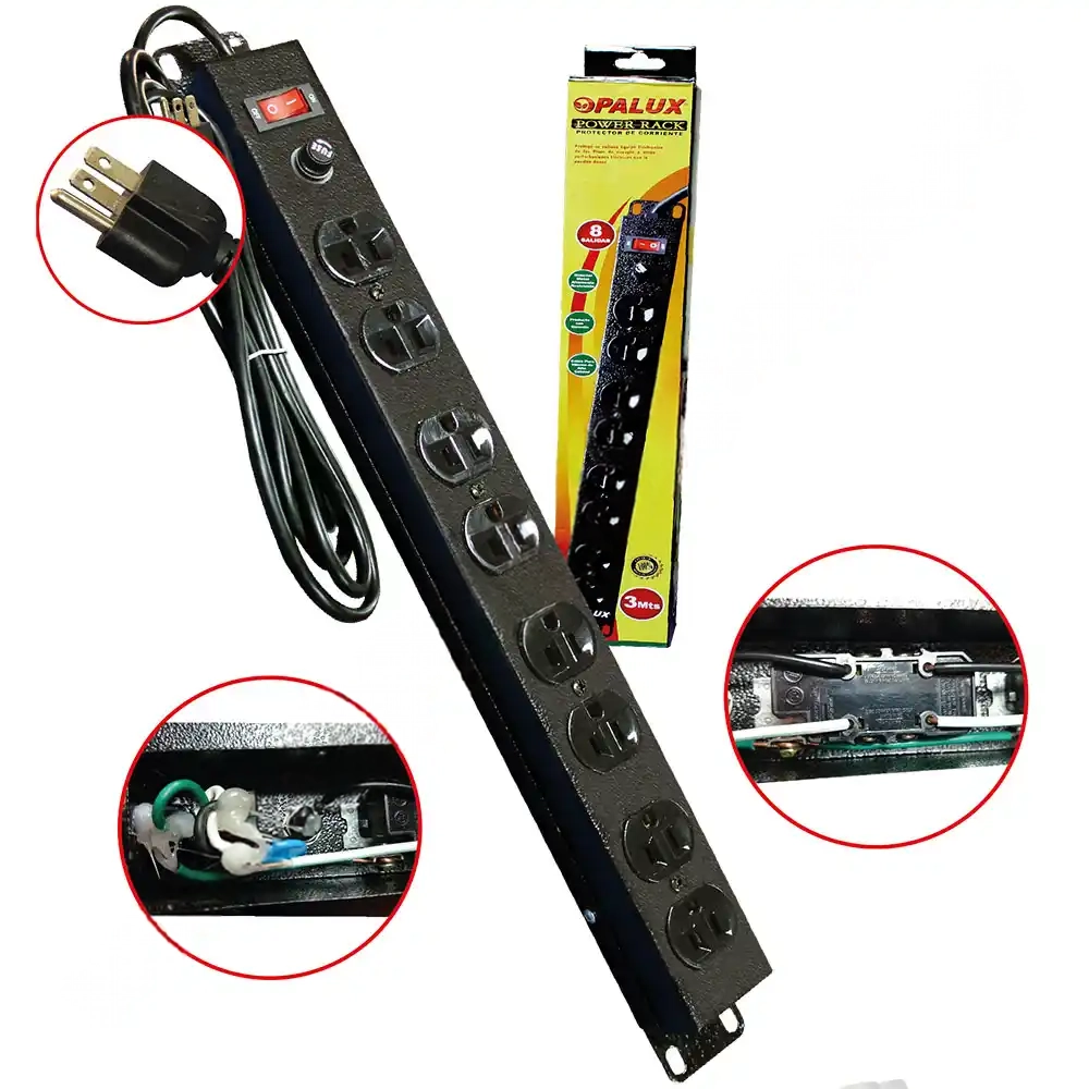 Power Rack PDU 8 tomas trifasicas 10AMP con Fusible 1 RU con toma a tierra 1 switch ON/OFF cable 3mts 14AWG 100% Cobre “OPALUX” color negro